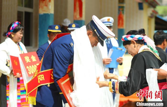 圖為村民為巴桑旺堆獻(xiàn)上哈達(dá)?!∥骼@拉翁 攝