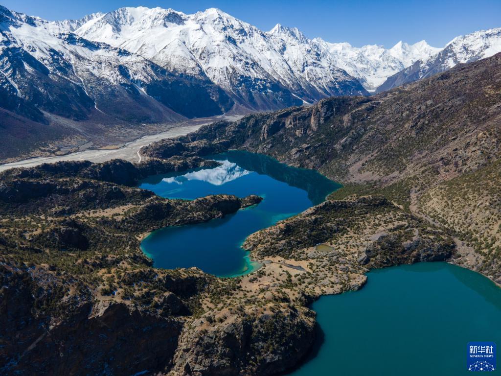 黑湖映射出雪山的倒影(4月2日攝,無人機照片)。新華社記者 周荻瀟 攝