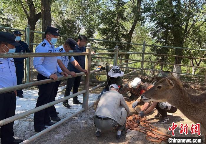 圖為青海省野生動(dòng)物救助中心工作人員對(duì)白唇鹿進(jìn)行檢查?!〖庠h公安局供圖