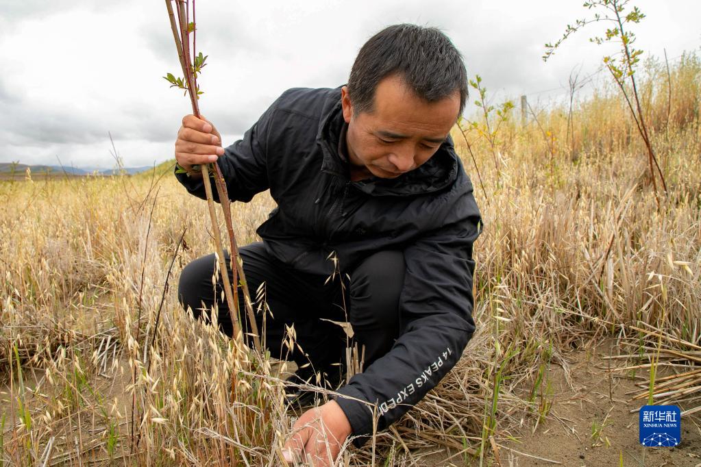 瑪曲縣自然資源局高級工程師馬建云在黃河瑪曲段干流沿岸一處阻沙林帶建設區(qū)域觀察植被生長情況(9月16日攝)。新華社記者 郎兵兵 攝