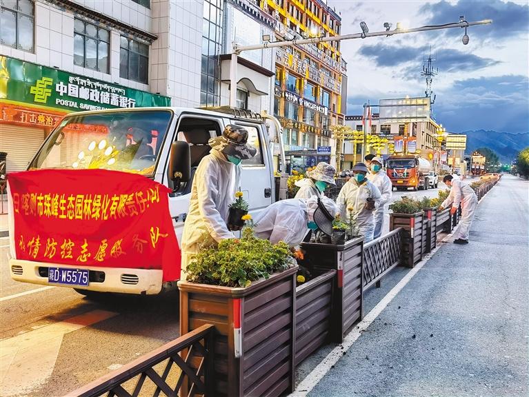 日喀則市在城區(qū)主干道花壇內(nèi)栽植鮮花