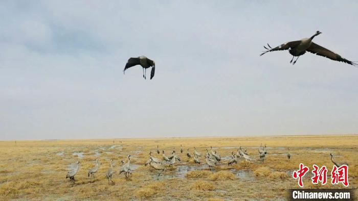 監(jiān)測(cè)顯示,格爾木市拖拉海草原是蓑羽鶴遷徙過(guò)程中的重要停歇地。每年十月初左右,少則數(shù)百只多達(dá)數(shù)千只蓑羽鶴都會(huì)聚集于此,補(bǔ)充能量,再蓄力南飛。它們?cè)谶@里涉水覓食,振翅高飛,水草豐美的濕地為它們提供了歇腳的舒適環(huán)境。