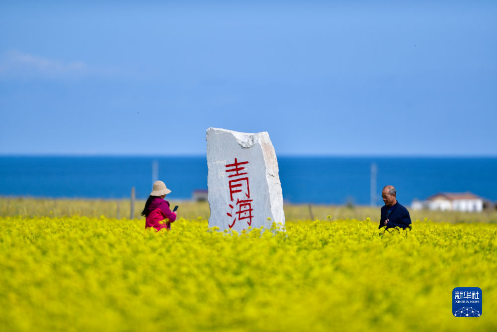 游客在青海湖畔的油菜花田里游玩(2019年9月14日攝)。新華社記者 張龍 攝