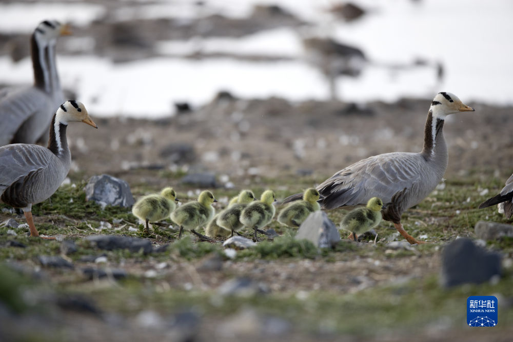幾只斑頭雁在青海湖鳥島濕地活動(dòng)(2020年6月2日攝)。新華社 星智 攝