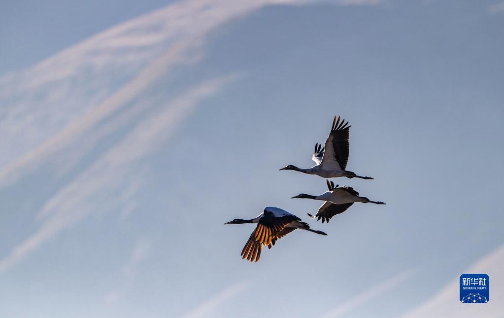 黑頸鶴在林周縣強嘎鄉(xiāng)上空飛翔(11月6日攝)。新華社記者 周荻瀟 攝