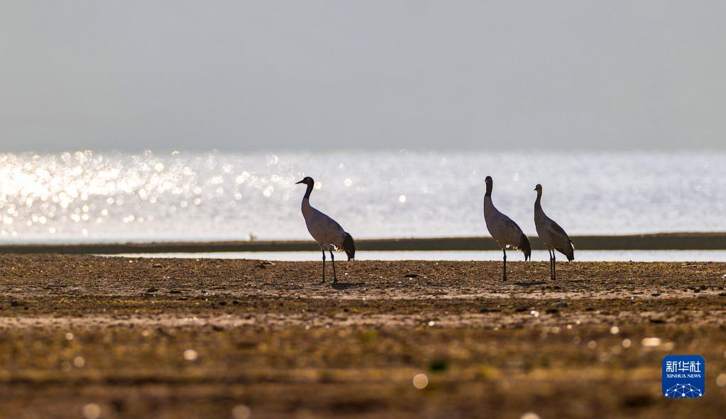 黑頸鶴在林周縣虎頭山水庫休憩(11月6日攝)。新華社記者 呂秋平 攝
