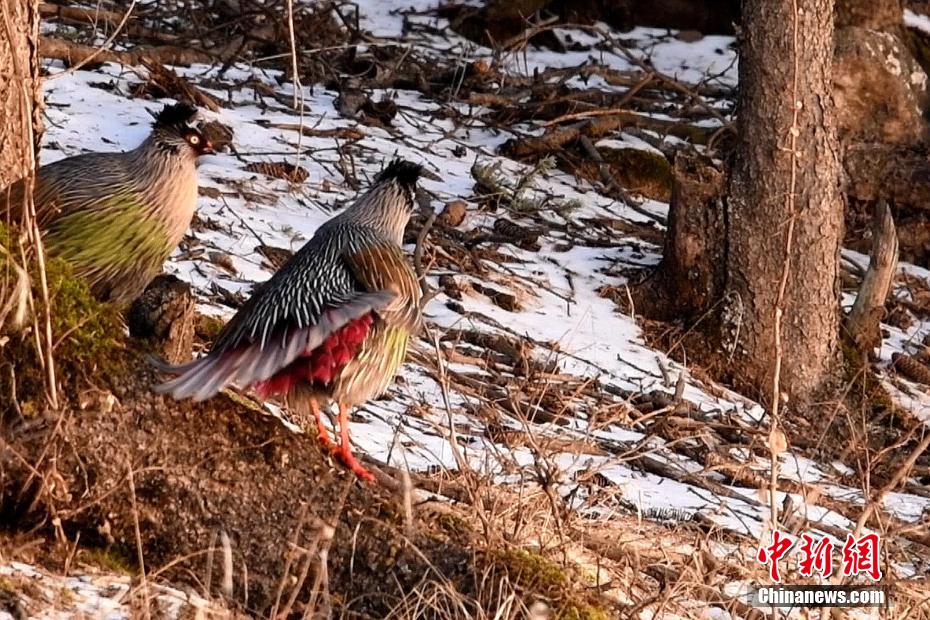 高原初冬,在位于祁連山國家公園青海片區(qū)的海北州門源縣,寺溝管護站管護員在日常巡護途中,拍攝到幾只國家二級保護動物血雉在林間悠閑覓食的珍貴影像。血雉是高寒山地森林及灌叢雉類,棲息于雪線附近的高山針葉林、混交林及杜鵑灌叢中,海拔高度多在1700-3000米,主要分布于中國,系中國特有物種。血雉素有高原“顏值擔(dān)當(dāng)”物種之稱,血雉外形似眼戴太陽鏡、腳著紅色小靴,行進跳躍間時不時以喙梳理“漸變色”羽毛?;顒訒r常有雄鳥擔(dān)任警衛(wèi),遇危險時擔(dān)任警衛(wèi)的雄鳥常發(fā)出急促的“si”聲,其余個體聞聲后立刻鉆入林下草叢或灌叢中隱蔽。圖為血雉梳理羽毛。王國忠 攝