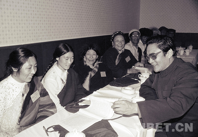 這是時任西藏自治區(qū)黨委副書記熱地(右)在與人大代表進行交流。1988年1月15日至23日,西藏自治區(qū)第四屆人民代表大會第六次會議在拉薩召開(唐召明1988年攝)