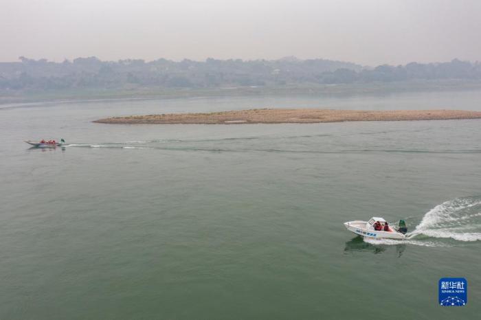 2023年2月7日,鴻鵠護魚志愿隊隊員在長江重慶江津段巡護(無人機照片)。新華社記者 黃偉 攝