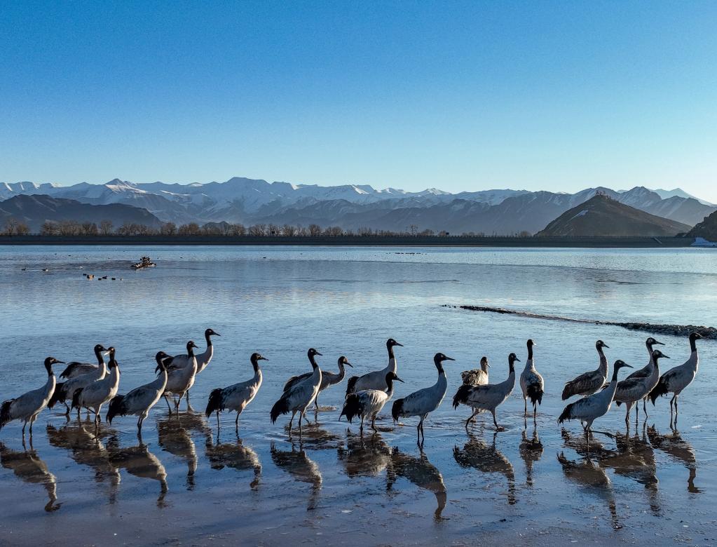 在拉薩市林周縣卡孜水庫拍攝的黑頸鶴(3月1日攝)。新華社記者 孫非 攝