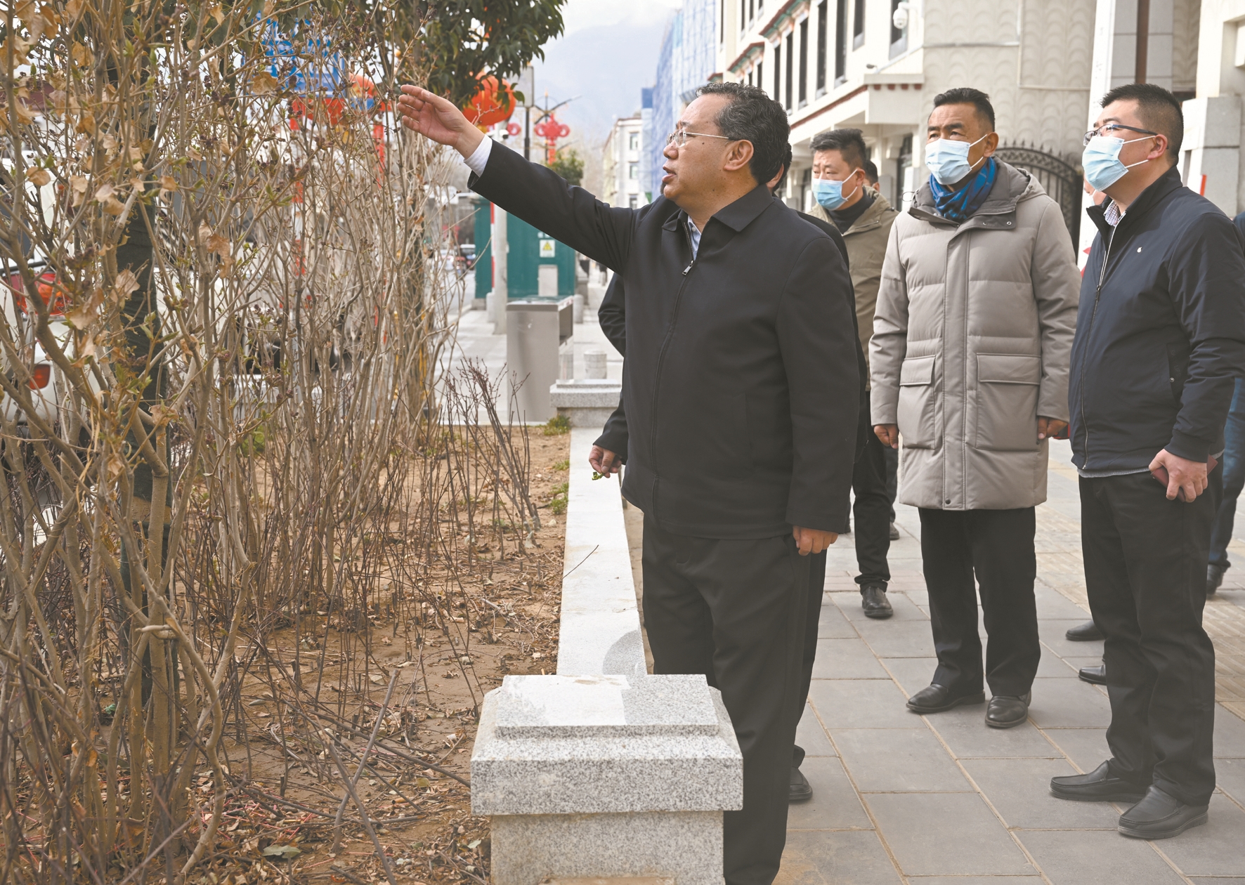 3月15日,西藏自治區(qū)黨委常委、市委書記普布頓珠帶隊深入城關區(qū),調(diào)研城市建設管理工作。圖為普布頓珠在朵森格路中段調(diào)研道路兩旁綠化帶植物缺損問題。拉薩融媒記者 巴桑次仁攝