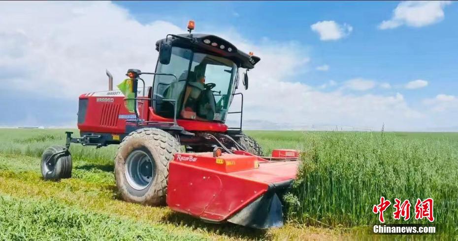 9月以來,位于柴達(dá)木盆地的青海省德令哈市尕海鎮(zhèn)的萬畝優(yōu)質(zhì)紫花苜蓿迎來收獲季。圖為收割機(jī)正在作業(yè)。