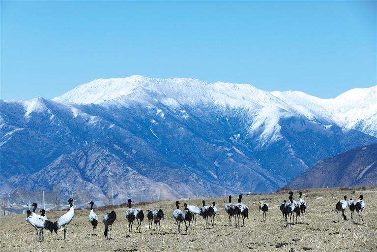 國家一級保護(hù)動物黑頸鶴在墨竹工卡縣境內(nèi)的農(nóng)田里覓食。