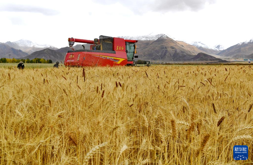 工作人員駕駛農(nóng)業(yè)機(jī)械在西藏拉薩市林周縣曲果強(qiáng)村的高標(biāo)準(zhǔn)農(nóng)田里收獲小麥(10月12日攝)。新華社記者 張汝鋒 攝