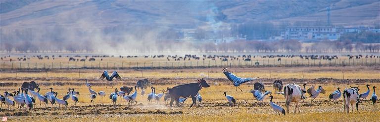 卡孜濕地是其中一個(gè)投食點(diǎn)?,F(xiàn)年43歲的洛桑次旦就住在附近,每天一大早,他都會(huì)到卡孜濕地放牧。“‘鄰居’越來越多了,十幾年的時(shí)間,黑頸鶴的數(shù)量從幾只增長(zhǎng)到幾百只。”洛桑次旦告訴記者,黑頸鶴和牛各吃各的,互不干擾,非常和諧。