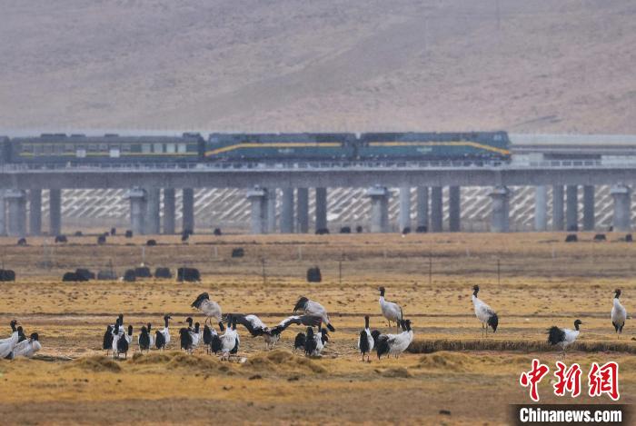 遠處,有火車沿著青藏鐵路鳴笛經(jīng)過,黑頸鶴們“淡定一瞥”,仿若未聞其聲,繼續(xù)欣賞水中的倒影,于鳥鳴處處,水聲悠悠間自得其樂。
