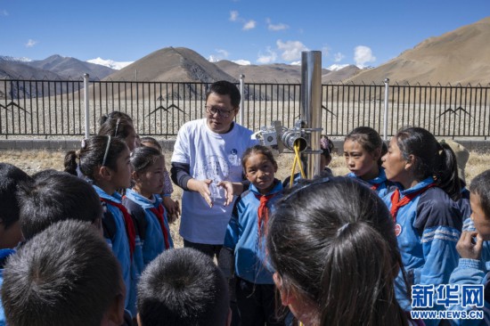 5月23日,工作人員為參加“公眾科學日”活動的學生介紹珠峰站內(nèi)的科研設(shè)備。新華社記者 普布扎西 攝