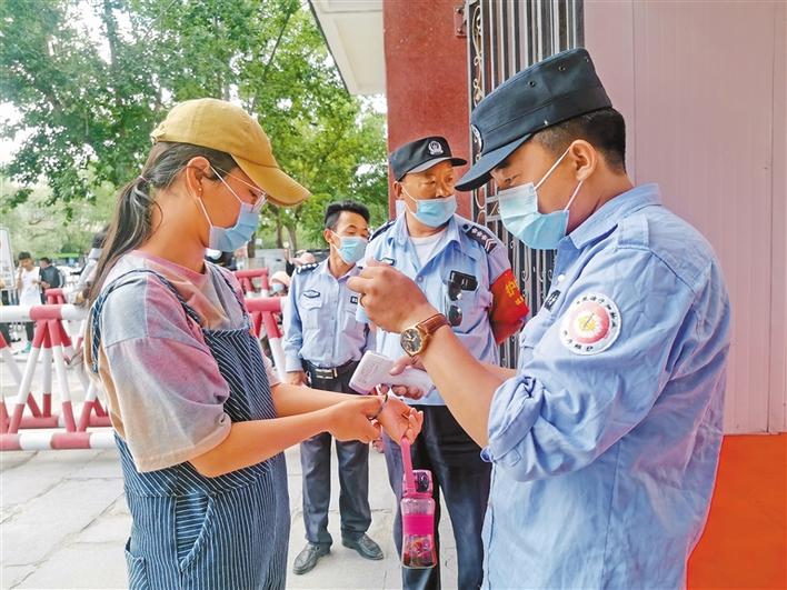 圖為在拉薩中學(xué)考點(diǎn)門(mén)口,工作人員對(duì)即將進(jìn)入考點(diǎn)熟悉環(huán)境的考生進(jìn)行體溫檢測(cè)和身份驗(yàn)證。記者 王莉 攝