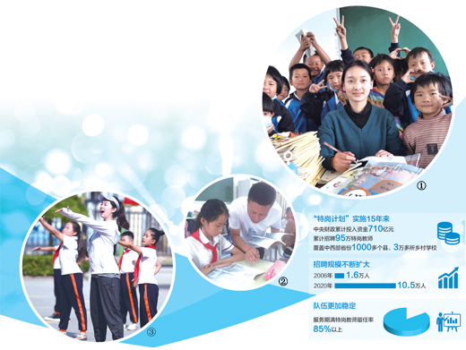 15年來,“特崗計劃”共為中西部地區(qū)22個省份1000多個縣的3萬多所鄉(xiāng)村學(xué)校和教學(xué)點(diǎn)補(bǔ)充95萬名中小學(xué)教師。通過“特崗計劃”直接或間接補(bǔ)充的教師,是新中國成立以來數(shù)量最多、學(xué)歷最高、待遇保障最為齊全的新一代鄉(xiāng)村教師。