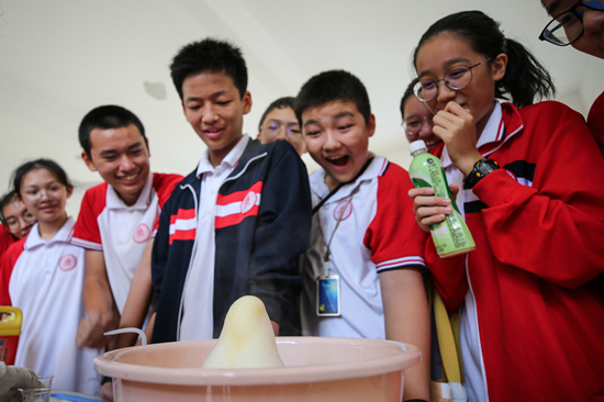 10月26日,北京師范大學(xué)??诟綄賹W(xué)校的學(xué)生參與化學(xué)趣味實(shí)驗(yàn)。當(dāng)日,北京師范大學(xué)??诟綄賹W(xué)校舉行第三屆科技人文節(jié)活動(dòng),在校內(nèi)營(yíng)造愛(ài)科學(xué)、學(xué)科學(xué)的良好氛圍。