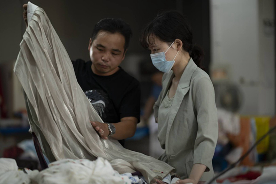 圖為劉童童(右)在漢服工廠內(nèi)研究漢服布料設(shè)計(jì)、制作細(xì)節(jié)。受訪者供圖