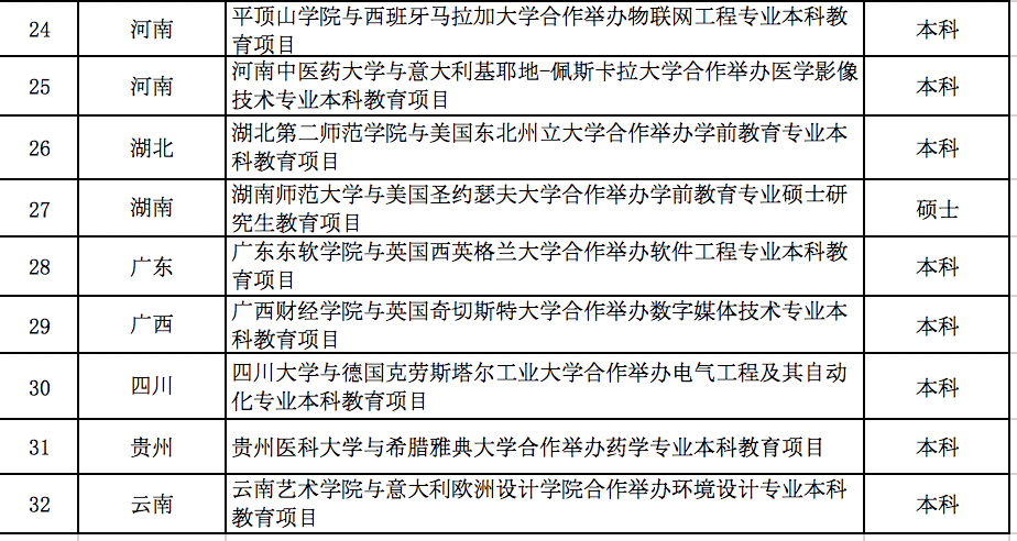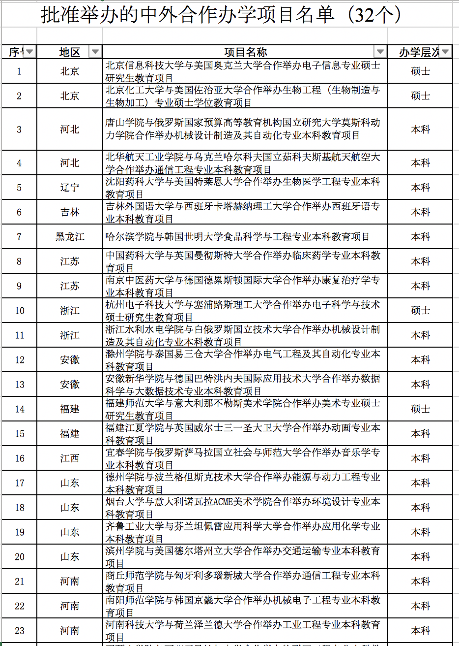 32個中外合作辦學項目名單如下: