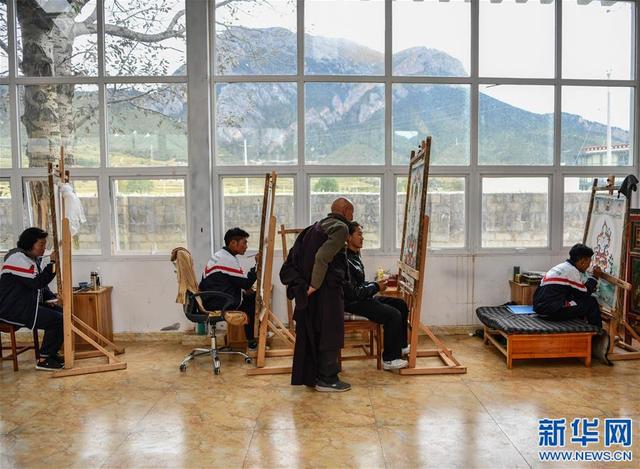 嘎瑪?shù)吕绽先嗽谖鞑夭际锌ㄈ魠^(qū)嘎瑪鄉(xiāng)的民族手工藝培訓(xùn)基地里教學(xué)員們畫(huà)唐卡(10月3日攝)。新華社記者 晉美多吉 攝