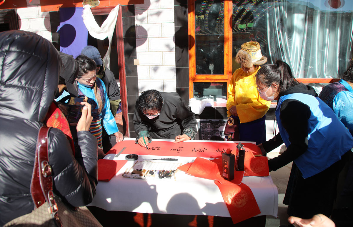 西藏自治區(qū)書協(xié)副主席、拉薩市書協(xié)副主席南杰旺扎說:“值此新春佳節(jié)和藏歷新年來臨之際,拉薩市文聯(lián)書法家協(xié)會組織了三位老師來到吉蘇村開展送書法活動,一是宣傳黨的好政策,二是雙節(jié)臨近給基層干部群眾送上節(jié)日的祝福?!?/p>