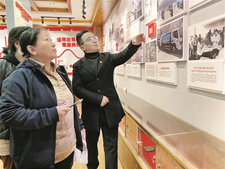 圖為在嘎瑪貢桑社區(qū)居委會(huì)“居史館”內(nèi),社區(qū)黨總支副書記、居委會(huì)主任尼瑪次仁帶領(lǐng)轄區(qū)干部群眾了解社區(qū)歷史。 拉薩融媒記者 旦增拉珍攝