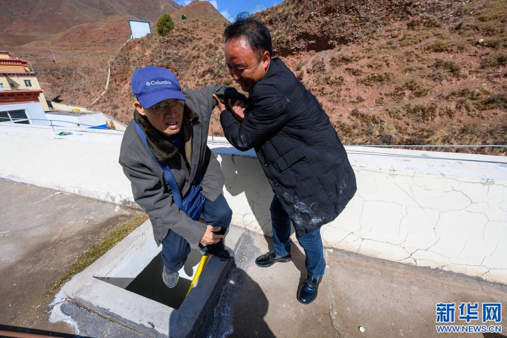 5月3日,在西藏昌都市類烏齊縣吉多鄉(xiāng)小學(xué),李純民(左)在吉多鄉(xiāng)小學(xué)校長(zhǎng)鄧增群培的幫助下,爬上學(xué)生食堂樓頂,監(jiān)督太陽(yáng)能熱水器的維修工作。新華社記者 劉金海 攝