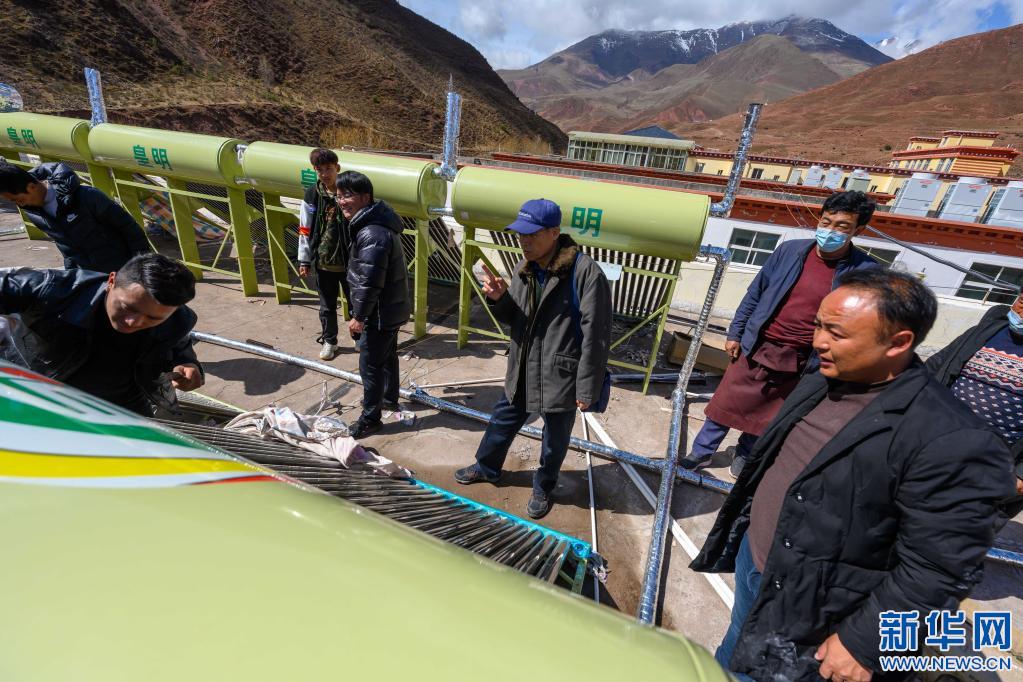 5月3日,在西藏昌都市類烏齊縣吉多鄉(xiāng)小學(xué),李純民(中)在吉多鄉(xiāng)小學(xué)學(xué)生食堂樓頂,監(jiān)督太陽(yáng)能熱水器的維修工作。2014年至2020年,“齊興”助學(xué)獎(jiǎng)勵(lì)基金通過(guò)多種方式,籌集資金200多萬(wàn),為類烏齊縣12所鄉(xiāng)鎮(zhèn)小學(xué)安裝太陽(yáng)能熱水器和多媒體教學(xué)一體機(jī)。新華社記者 劉金海 攝