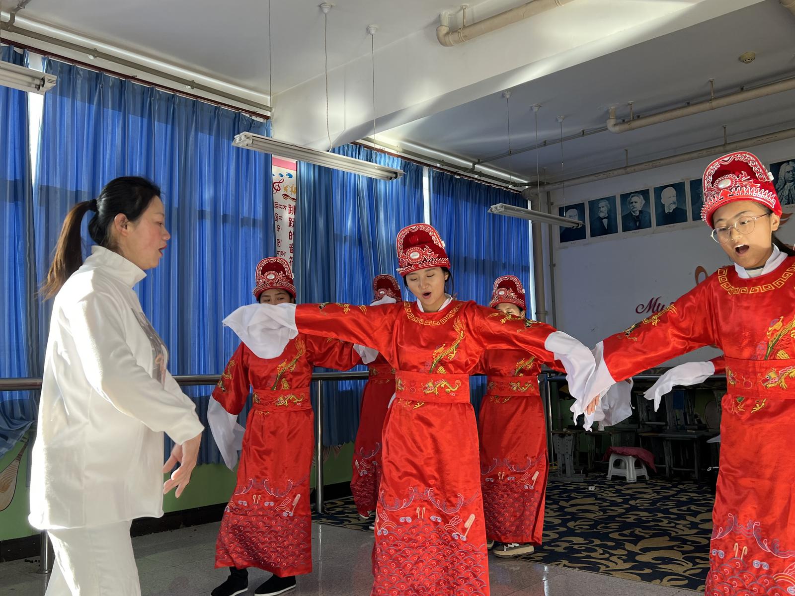 圖為老師正在指導(dǎo)學(xué)生黃梅戲的動(dòng)作要領(lǐng)。