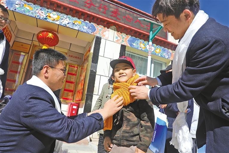 圖為建行職工在給小朋友佩戴愛心圍巾。記者 格桑倫珠 攝