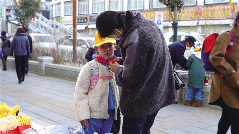 10日早上8時20分許,小學(xué)生們佩戴鮮艷的紅領(lǐng)巾、頭戴小黃帽,陸陸續(xù)續(xù)走進(jìn)拉薩市第一小學(xué)的校門。今年春季開學(xué)第一天,有些家長蹲在孩子面前,幫忙整理衣帽,同時鼓勵孩子“加油!”。