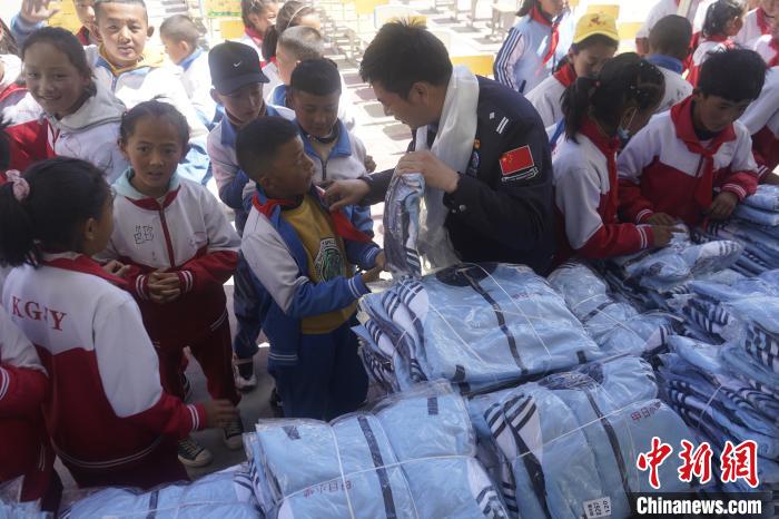 圖為拉薩出入境邊防檢查站的民警為學(xué)生發(fā)放校服?!∝暩聛?lái)松 攝