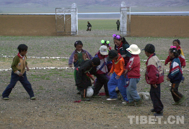 這是雙湖特別區(qū)(從雙湖辦事處改名而來,現(xiàn)為雙湖縣)嘎措鄉(xiāng)小學(xué)學(xué)生在課余時間踢足球(唐召明2001年攝)