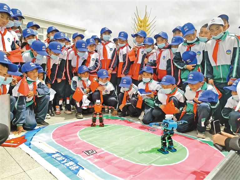 圖為啟動儀式現(xiàn)場,學(xué)生圍觀科技產(chǎn)品“機(jī)器人跳舞”的場景。記者 扎西頓珠 攝