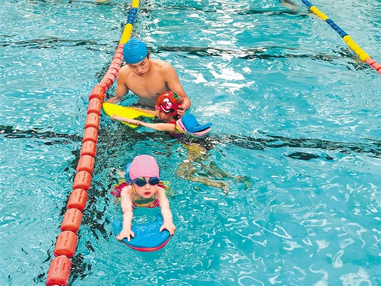 圖為青少年兒童在教練的指導(dǎo)下學(xué)習(xí)游泳。