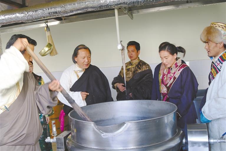 圖為國家級非物質(zhì)文化遺產(chǎn)代表性項(xiàng)目——藏醫(yī)藥浴法傳承人明珠(左二)指導(dǎo)學(xué)生(制藥師)煎熬“五味甘露”。山南市藏醫(yī)醫(yī)院供圖