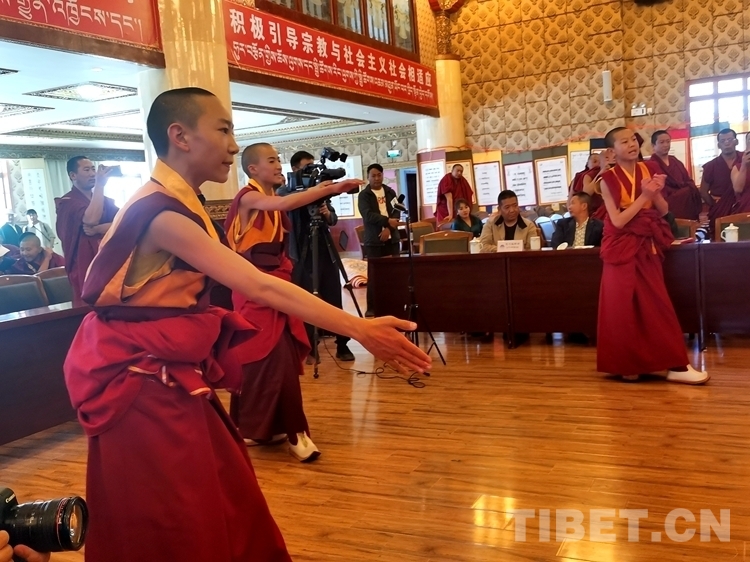 據了解,與傳統(tǒng)寺廟教育相比,西藏佛學院開設有文化課和佛學兩大體系,天資聰慧的少年活佛們在校期間已經開始研習含義深刻、博大精深的《五部大論》《入菩薩行論》等佛教經典作品,目前已經可以流暢地背誦部分經典。在當日的學習成果匯報展示會上,少年活佛們不僅展示了藏漢雙語朗誦、藏漢文書法、英語情景劇等,也為大家?guī)砹恕度肫兴_行論》第一章的背誦展示和辯經展示。