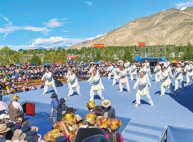 西藏自治區(qū)山南市各族太極拳愛好者進(jìn)行傳統(tǒng)楊氏太極拳表演。