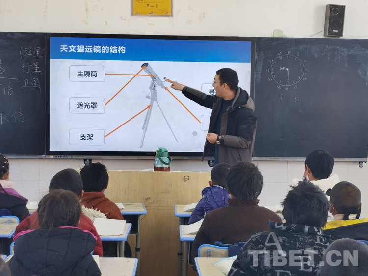 11月30日,王建煜受邀來到海拔4300多米的騾子溝小學,帶著天文設備為牧區(qū)孩子們上了一節(jié)望遠鏡觀測入門課。王建煜通過PPT展示了豐富的天文社團活動,引起了孩子們強烈的好奇心和探索心。他介紹到,要想觀測到遙遠的地方,必須要借助工具,而天文望遠鏡,就是我們觀測星空的工具。