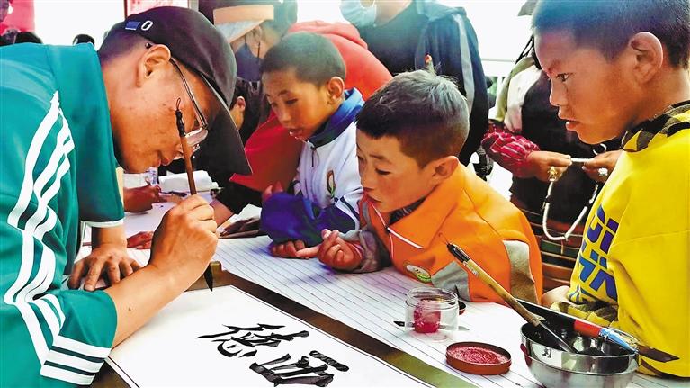 圖為阿里地區(qū)書畫家進(jìn)社區(qū)活動(dòng)現(xiàn)場(chǎng),為群眾書寫扎西德勒。通訊員 唐磊 攝