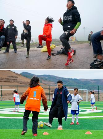 上圖:2019年5月26日,孩子們?cè)谕呶嵝W(xué)的泥地足球場(chǎng)上訓(xùn)練。下圖:3月3日,瓦吾小學(xué)的女足隊(duì)員們?cè)凇懊倒鍓?mèng)想球場(chǎng)”上訓(xùn)練。新華社記者沈伯韓攝