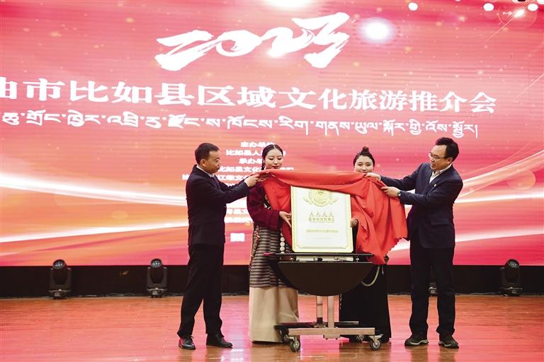 隨后,比如縣、索縣、巴青縣、嘉黎縣代表依次通過文旅資源推介向大家展現(xiàn)了不同縣區(qū)別樣的自然風(fēng)光與人文風(fēng)采。同時(shí),現(xiàn)場還舉辦了比如唐蕃古道文化旅游景區(qū)國家AAAA級旅游景區(qū)揭牌儀式。