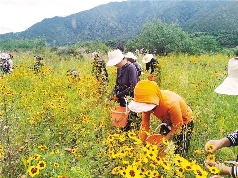 圖為巴宜區(qū)人社局聯(lián)合林芝林卡旅游開發(fā)有限公司開展“以工代訓(xùn)”,組織農(nóng)牧民群眾在布久鄉(xiāng)工布原鄉(xiāng)景區(qū)采收雪菊。通訊員 楊健 記者 謝筱純 王珊 攝