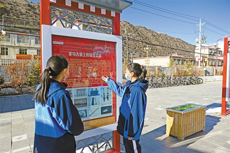 那曲市嘉黎縣中學民族團結長廊解說員(右)向同學講解茶馬古道上的民族團結故事。記者 薛瑩 益西加措 攝