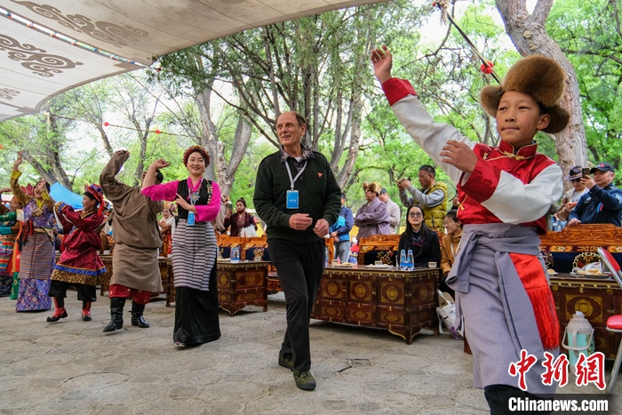 圖為5月19日,柯馬凱在拉薩羅布林卡聽(tīng)藏戲,和當(dāng)?shù)夭刈迕癖娨坏捞伹f舞。 中新社記者 江飛波 攝