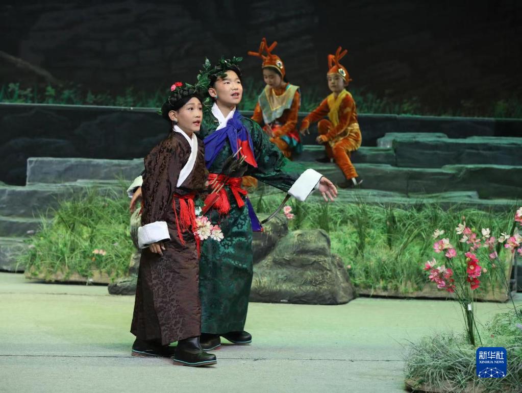 藏戲小演員在舞臺上表演少兒舞臺劇藏戲《頓月頓珠》。西藏自治區(qū)藏劇團供圖