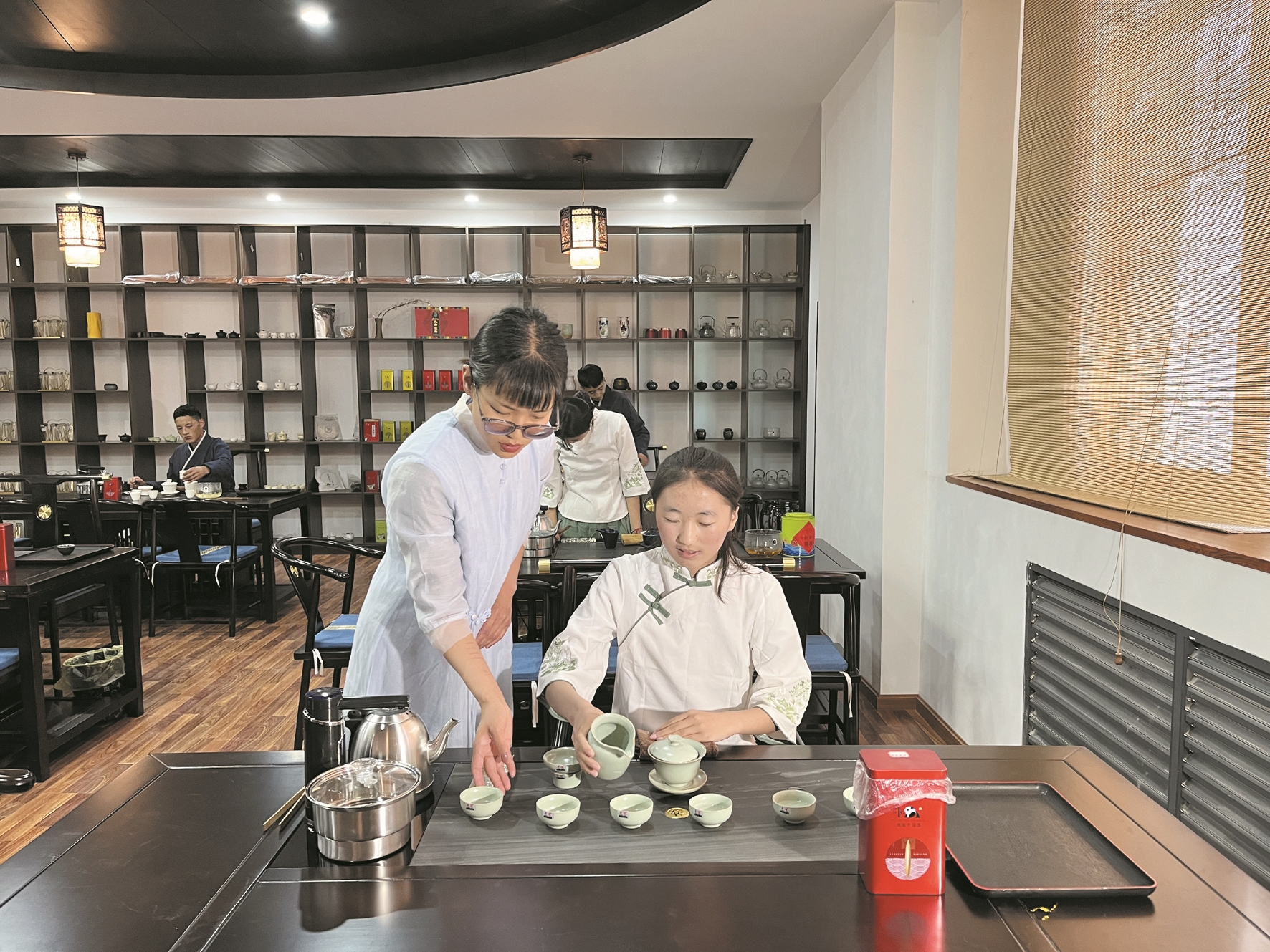學(xué)校茶藝室里,學(xué)生們身穿飄逸的漢服,手捧精美茶器,伴隨著古典清雅的音樂,氣定神閑、舉止優(yōu)雅地溫具、置茶、沖泡、奉茶,一雙雙巧手在茶席間流轉(zhuǎn),精妙的茶藝展現(xiàn)得淋漓盡致。